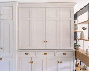 The cabinetry is elegantly painted with Farrow & Ball, showcasing the soft hues of Cornforth White, Railing, and Hardwick White, which complement the classic lines of the design. The addition of aged brass handles from Armac Martin adds a touch of sophistication and warmth, enhancing the overall aesthetic.